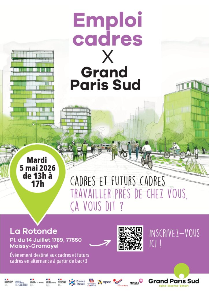 Cadres et futurs cadres (jeunes diplômés à partir de bac +3), Grand Paris Sud et l’APEC vous invitent à rencontrer les entreprises qui recrutent près de chez vous mardi 5 mai de 13h à 17h à la Rotonde.