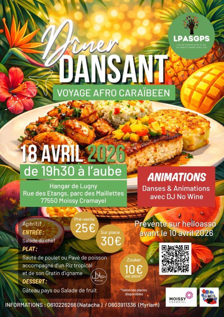 L’association LPASGPS (Lien de Parentalité et de Solidarité Grand Paris Sud) organise un dîner dansant animé par DJ No Wine, autour du thème “voyage afro-caraïbéen”, le samedi 18 avril à 19h30 au Hangar de Lugny.